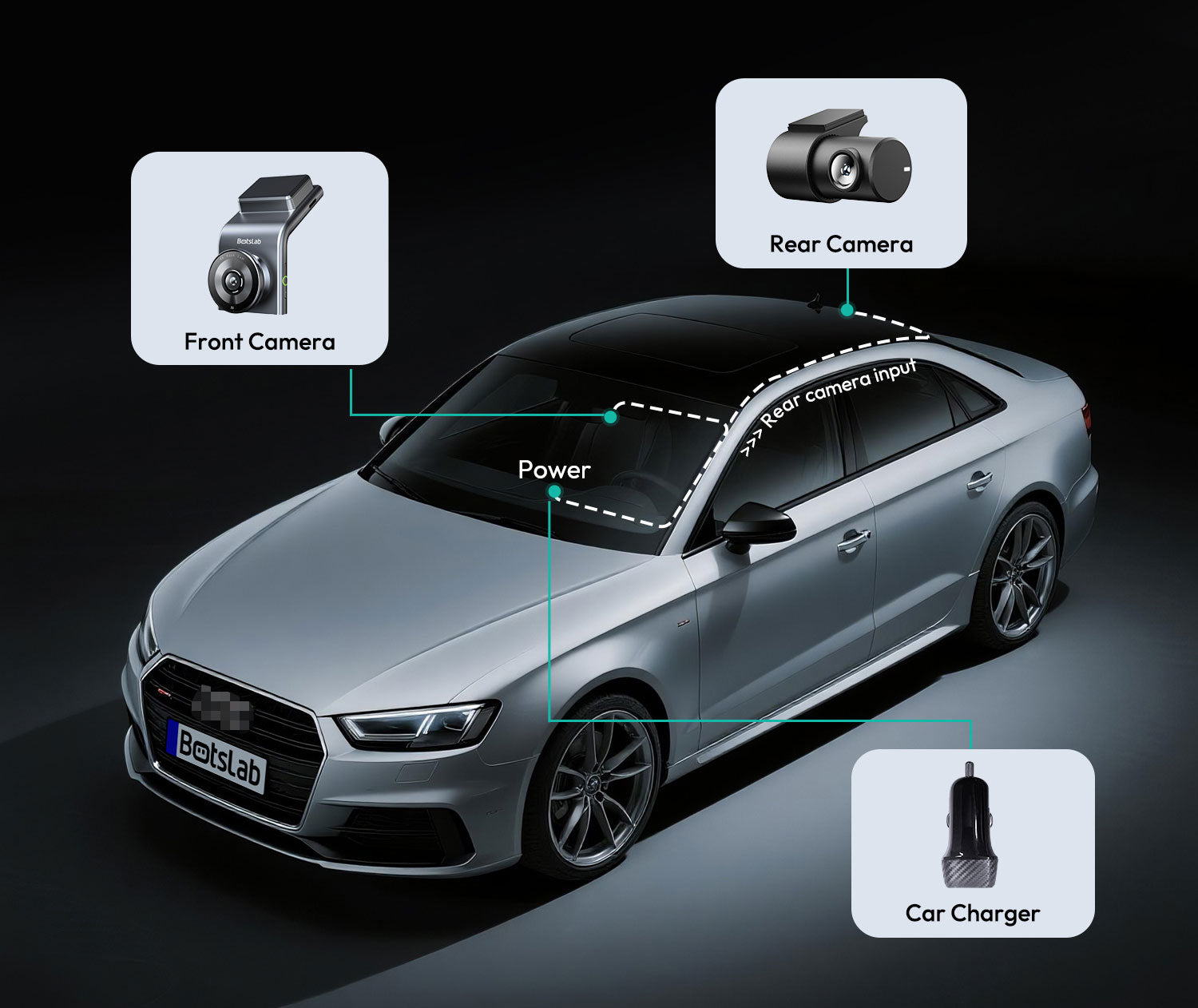Der Botslab G300H Plus wird mit einer FullHD-Rückfahrkamera geliefert, die für die Montage an der Innenseite der Heckscheibe konzipiert ist. Die Rückfahrkamera ist nicht wasserdicht und daher nur für die Innenmontage geeignet.