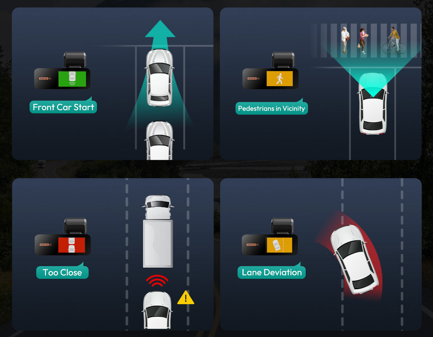 Diese Botslab G980H Pro kann den Fahrer unterstützen, indem sie bei gefährlichen Situationen Warnungen ausgibt. In den folgenden Situationen wird auf Wunsch eine Warnung ausgegeben: