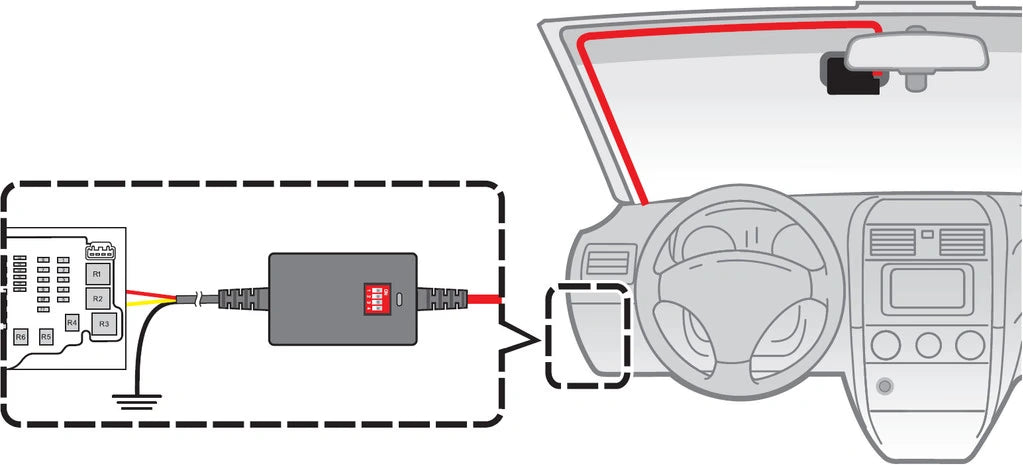 Da diese MiVue-Stromversorgung an zwei verschiedene Stromquellen angeschlossen ist, erkennt die Dashcam, wenn die Zündung des Autos ein- und ausgeschaltet wird. Dadurch wechselt sie automatisch in den Parkmodus, wenn die Zündung des Autos ausgeschaltet wird, und beginnt wieder mit der regulären Aufnahme, wenn das Auto gestartet wird.