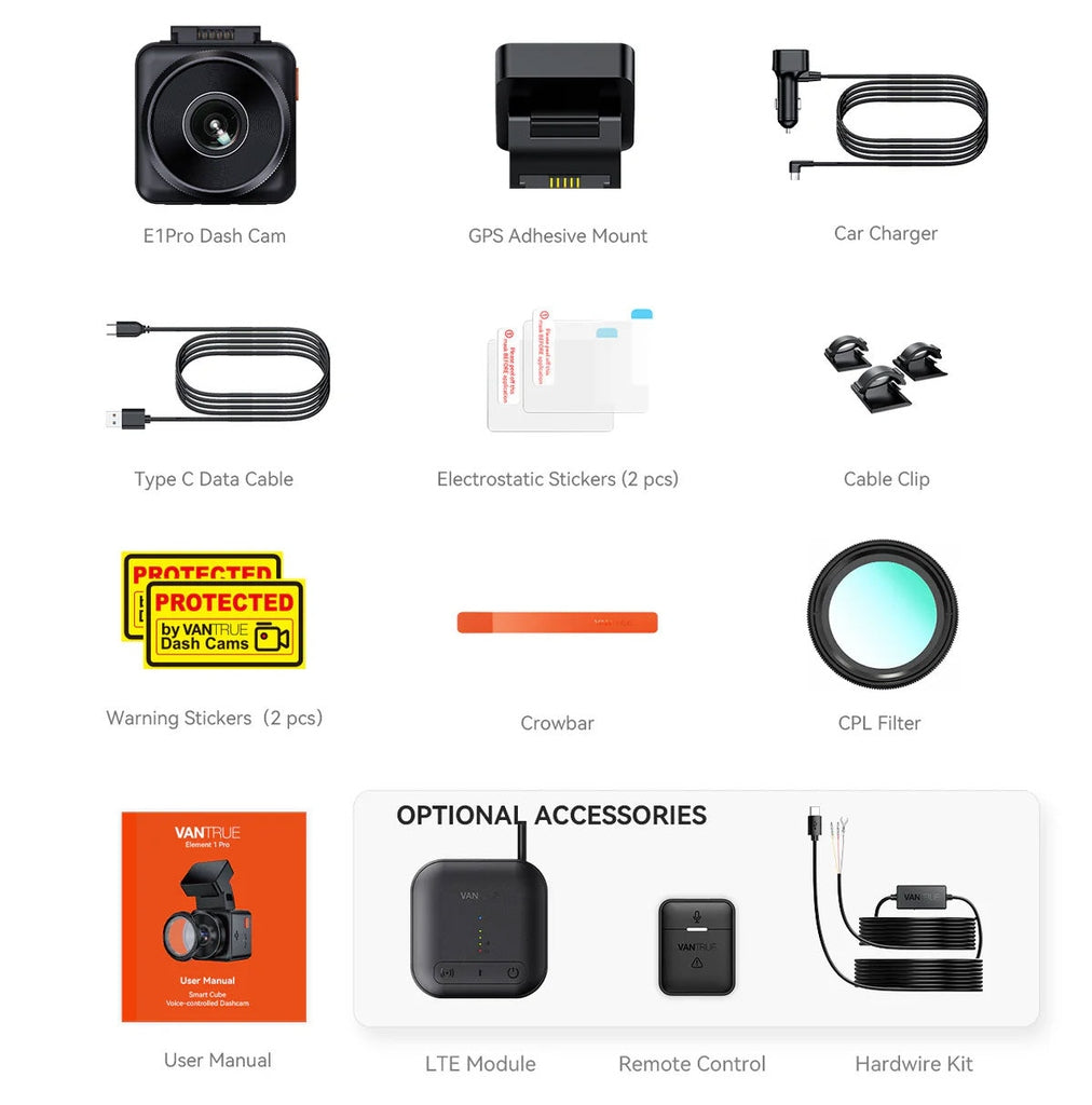 Die Vantrue E1 Pro ist die kleinste Cloud-Dashcam von Vantrue. Verbinden Sie sie mit dem optionalen LTE-Modul, um weltweit eine Verbindung zu Ihrer Kamera herzustellen. Dank des Sony Starvis IMX678-Bildsensors filmt sie in gestochen scharfer 4K-Auflösung, und mit der PlatePix-Technologie sind Kennzeichen immer gut erkennbar.