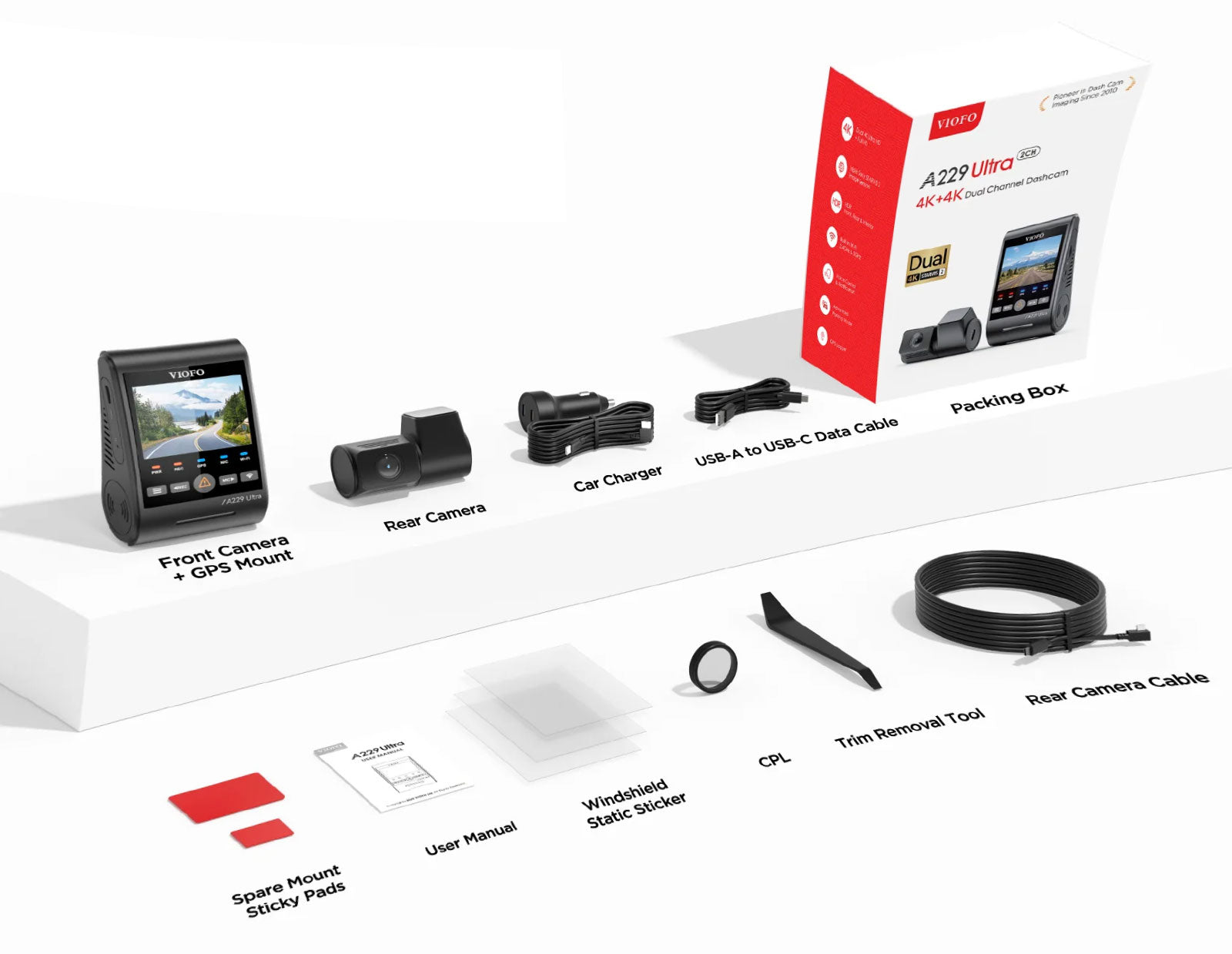 Die Viofo A229 Ultra 2CH ist die neueste Version der Viofo A229-Serie. Diese Ultra-Version filmt mit 4K-Auflösung vorne und hinten. Die Sony Starvis 2-Sensoren garantieren sowohl tagsüber als auch nachts Videos in bester Qualität.