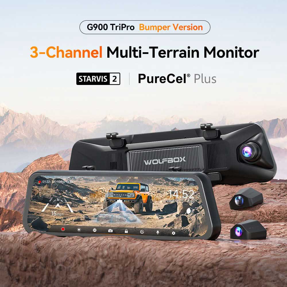 Die Wolfbox G900 Tripro Stoßstange ist die erste 3-Kanal-Spiegel-Dashcam mit einer Rückfahrkamera und einer dritten Kamera an der Vorderseite der Stoßstange. Diese Dashcam wurde speziell für den Offroad-Einsatz entwickelt. Die G900 Tripro filmt mit dem Starvis 2-Sensor in 4K vorne und 2,5K hinten. Die Stoßstangenkamera filmt in FullHD. Die Dashcam ist außerdem mit allen Funktionen wie WiFi, GPS und einem Parkmodus ausgestattet, um alle Ihre Fahrten und Parkvorgänge aufzuzeichnen.