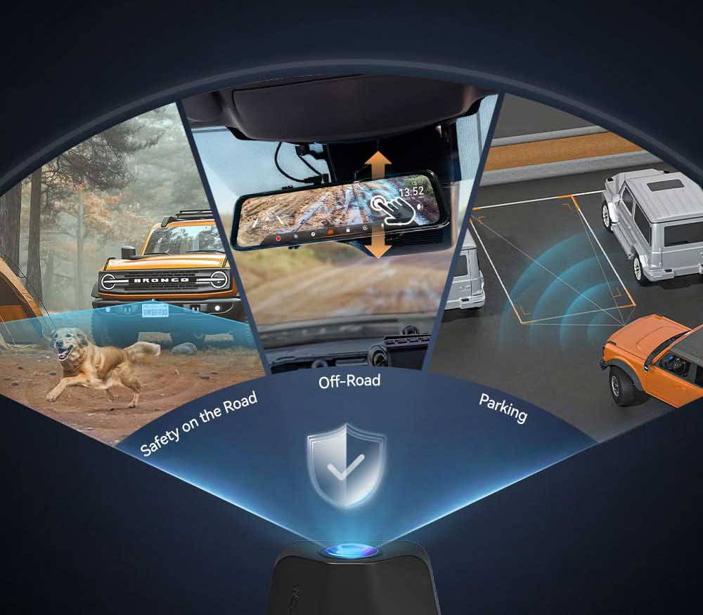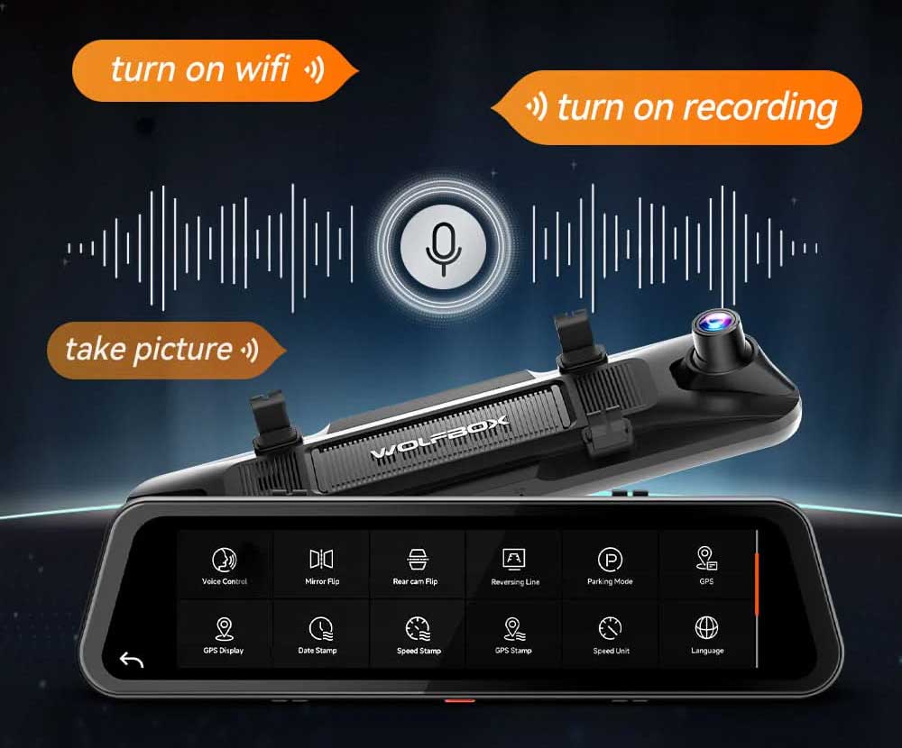 Die Wolfbox G900 Tripro 4K ist eine einzigartig gestaltete Spiegel-Dashcam und ein digitaler Innenspiegel in einem. Der große 12-Zoll-Spiegel fungiert gleichzeitig als volldigitaler LCD-Bildschirm, auf dem das Bild der Rückfahrkamera angezeigt werden kann. Die Wolfbox G900 ist daher ideal für Fahrzeuge mit schlechter Sicht nach hinten. Sie wird mit Halterungen geliefert, um sie über einem vorhandenen Innenspiegel anzubringen. Optional ist auch eine Halterung für die Windschutzscheibe oder für das Armaturenbrett für Fahrzeuge ohne Innenspiegel erhältlich.