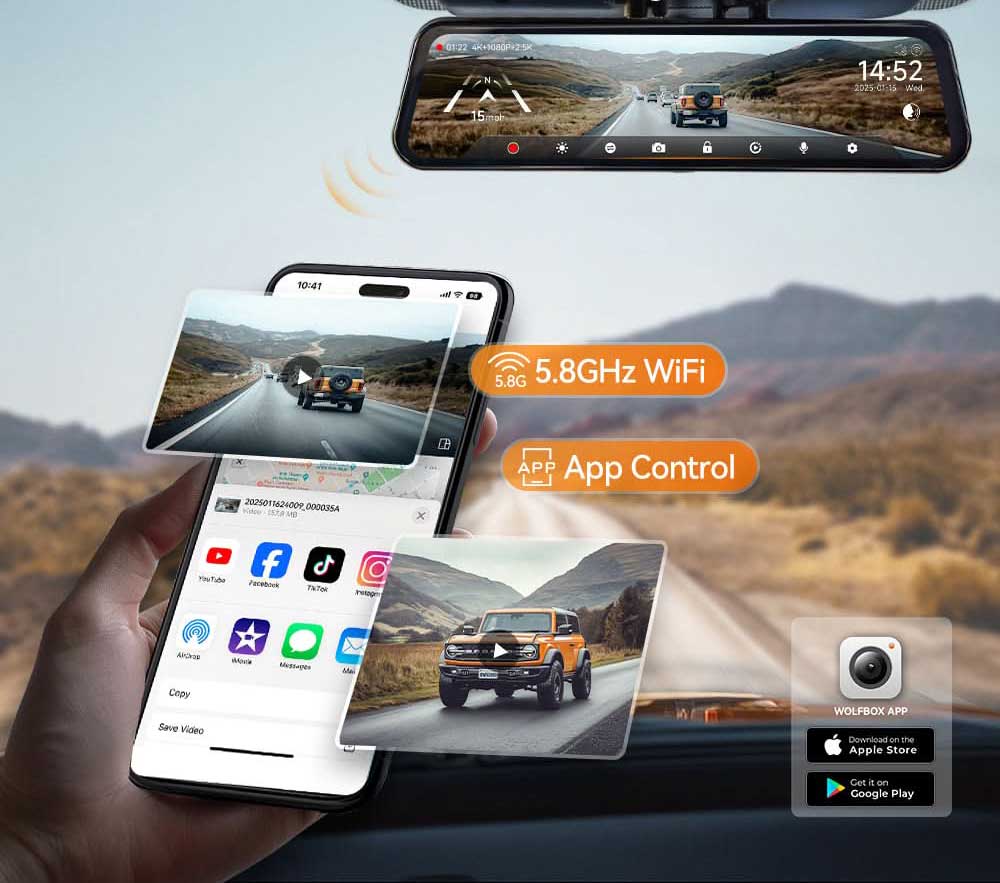 Die Wolfbox G900 Tripro ist mit superschnellem 5,8-GHz-WiFi ausgestattet. Über WiFi können Sie Ihr Telefon innerhalb der Reichweite der Kamera (+/- 5 Meter) mit der Kamera verbinden. Über die Wolfbox-App können Sie ganz einfach Videos ansehen, herunterladen oder teilen und die Kameraeinstellungen ändern.