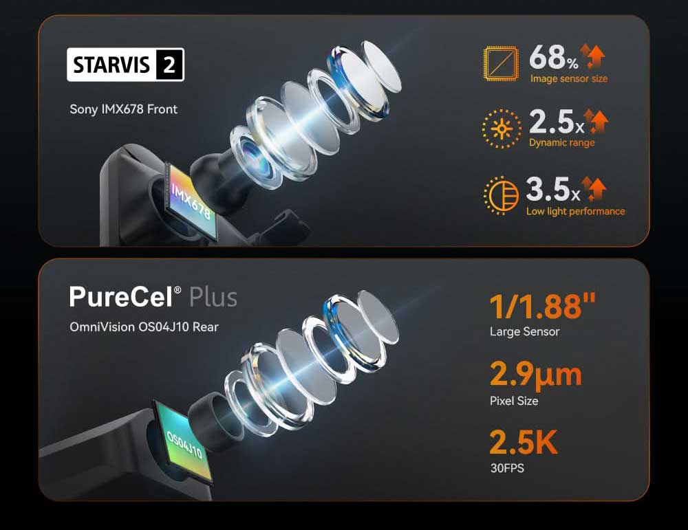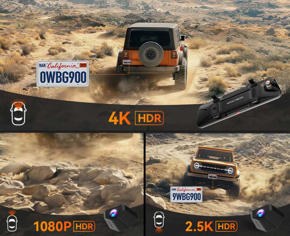 Die Wolfbox G900 Tripro ist mit dem neuesten Sony Starvis 2-Sensor ausgestattet, der insbesondere bei Dunkelheit für beste Bildqualität sorgt. Die Frontkamera nimmt in gestochen scharfer 4K-Auflösung mit 30 fps auf, die Rückkamera in 2,5K mit 25 fps. Die dritte Innenraumkamera filmt mit FullHD.