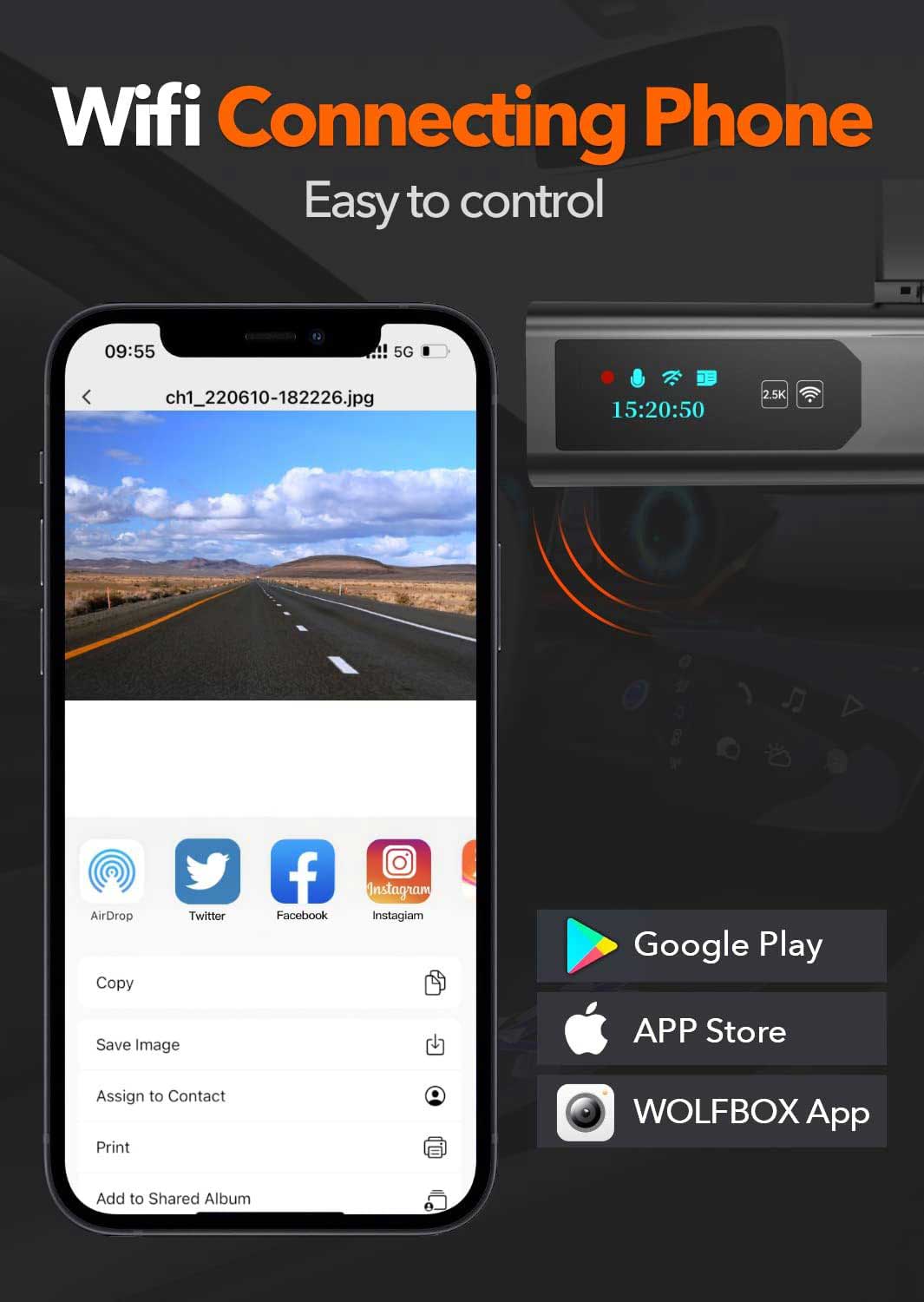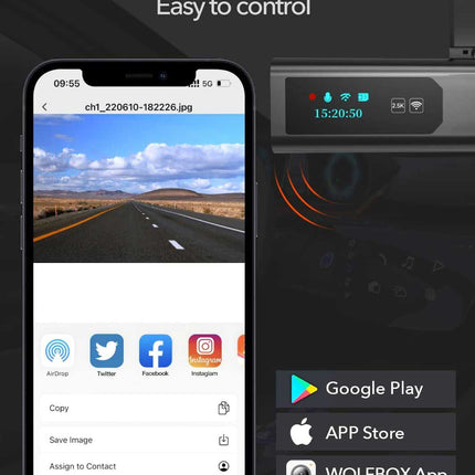 Die i03 2K WiFi Dashcam ist mit 2,4 GHz WiFi ausgestattet. Da diese Dashcam mit WiFi ausgestattet ist, kann das gesamte Filmmaterial einfach auf einem Smartphone angezeigt werden. Das WiFi hat eine Reichweite von etwa 10 Metern. Die Wolfbox-App ist für Android- und iPhone-Telefone verfügbar.