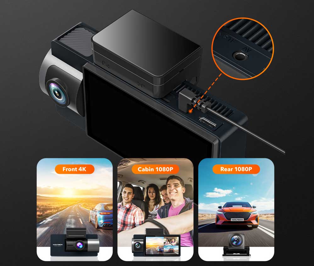 Was diese Wolfbox i17 so einzigartig macht, sind die drei Kameras, die alles im und um das Auto herum aufzeichnen. Die vordere Dashcam verfügt über zwei Kameras. Die vordere filmt alles, was vor dem Auto passiert, und die zweite filmt den Innenraum des Autos. Die Rückfahrkamera ist über ein 6 Meter langes Kabel mit der vorderen Dashcam verbunden und zeichnet alles hinter dem Auto auf.
