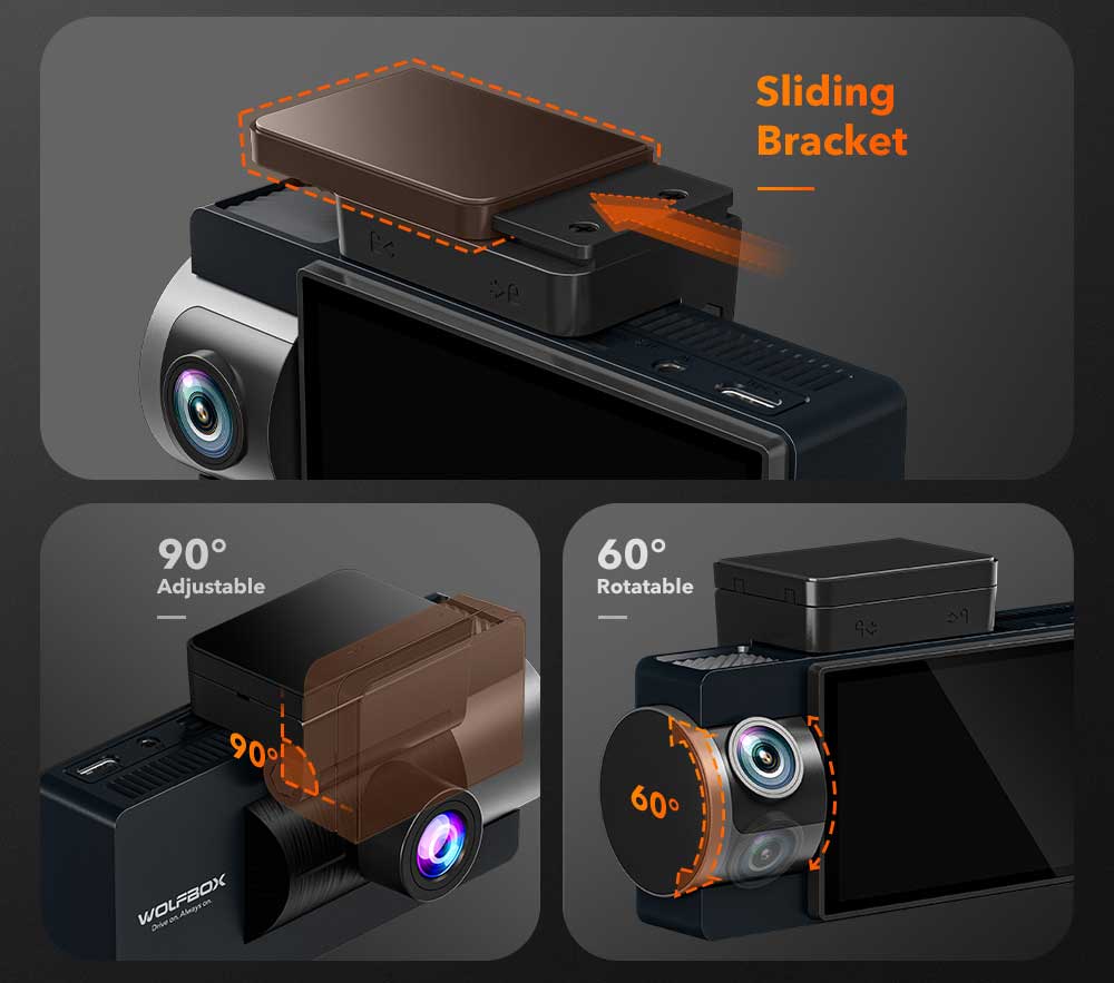 Das Gehäuse der i17 3CH 4K WiFi GPS Dashcam kann um 150 Grad vertikal gedreht werden und ist somit immer richtig auf die Straße ausgerichtet.